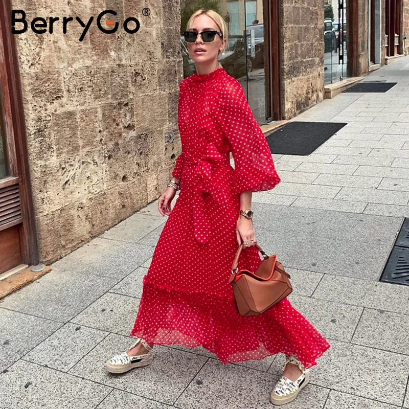 HIGH QUALITY BerryGo Polka dot print party dress women Lantern sleeve high waist female autumn dresses Ruffled h