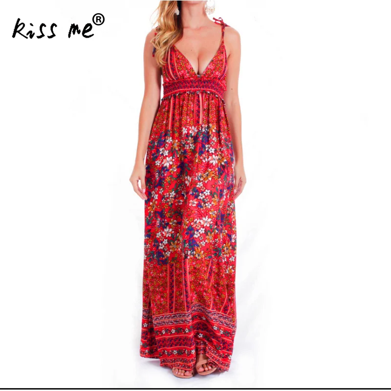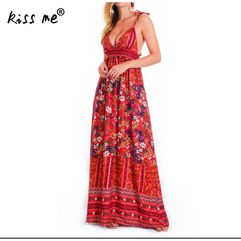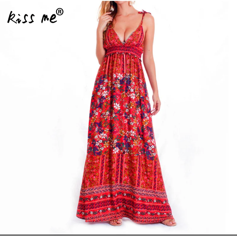 HIGH QUALITY Red Maxi Dress Deep V Sexy Beach Dress Bohemian Style Backless Strap Sling Chiffon Long Style Slip